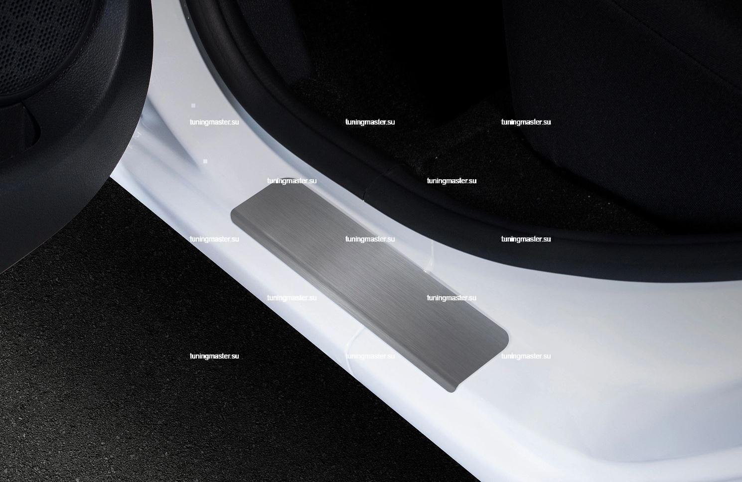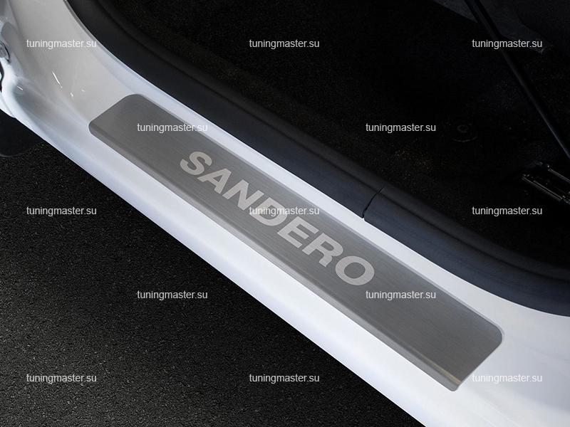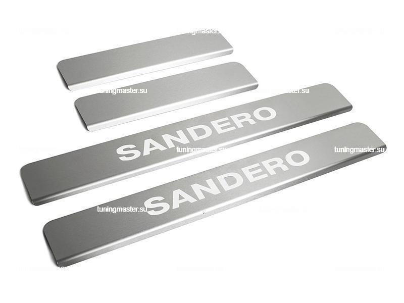 Накладки на пороги Renault Sandero с логотипом. Для автомобилей с 2014 год. Декоративные накладки на внутренние пороги RIVAL с логотипом марки автомобиля производят из высоколегированной нержавеющей стали и является отличным решением для тюнинга салона автомобиля. Хромированные накладки на пороги с геометрической точностью повторяют порог автомобиля. Накладки на пороги выполняют не только декоративную функцию, но и защищают поверхность от механических повреждений. Декоративные накладки на внутренние пороги автомобиля надежно крепятся с помощью 3М-скотча. В комплекте 4 шт.
