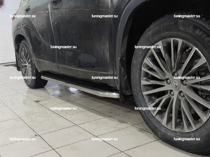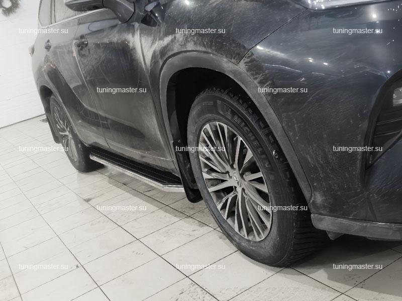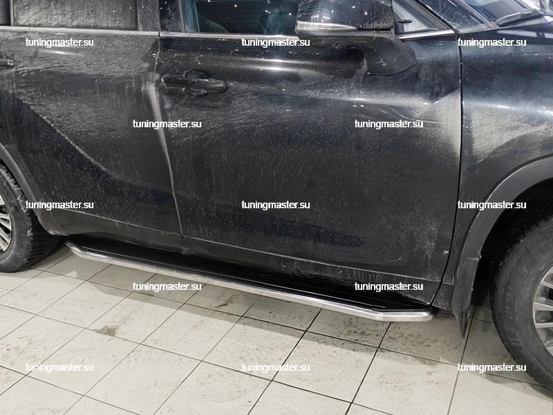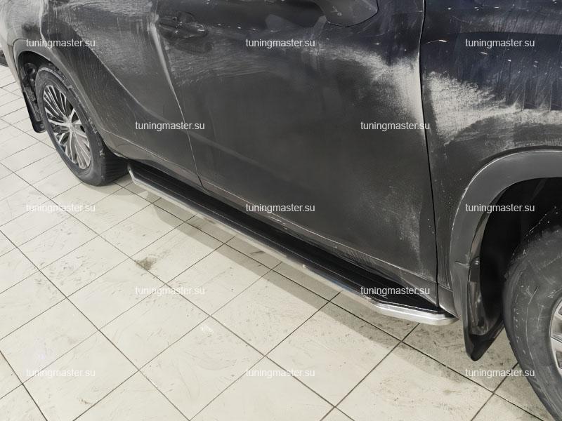 Пороги алюминиевые Toyota Highlander 4 (Premium). Боковые подножки для автомобиля Тойота Хайлендер предназначены для облегчения посадки и высадки пассажиров, а также для защиты кузова от механических повреждений при парковке близко к бордюру или другим препятствиям. Установка боковых порогов обычно производится на заводе при сборке автомобиля Тойота Хайлендер, но их также можно установить отдельно как дополнительное аксессуарное оборудование. Для этого необходимо выбрать подходящие пороги для конкретной модели автомобиля, следуя инструкциям производителя. При установке боковых подножек на Toyota Highlander необходимо убедиться, что они надежно закреплены кузовом автомобиля и не мешают открытию дверей. Также важно правильно подобрать высоту порогов, чтобы обеспечить удобный доступ к салону. В целом, боковые ступени являются полезным и стильным дополнением к автомобилю, обеспечивая дополнительный комфорт и защиту кузова.