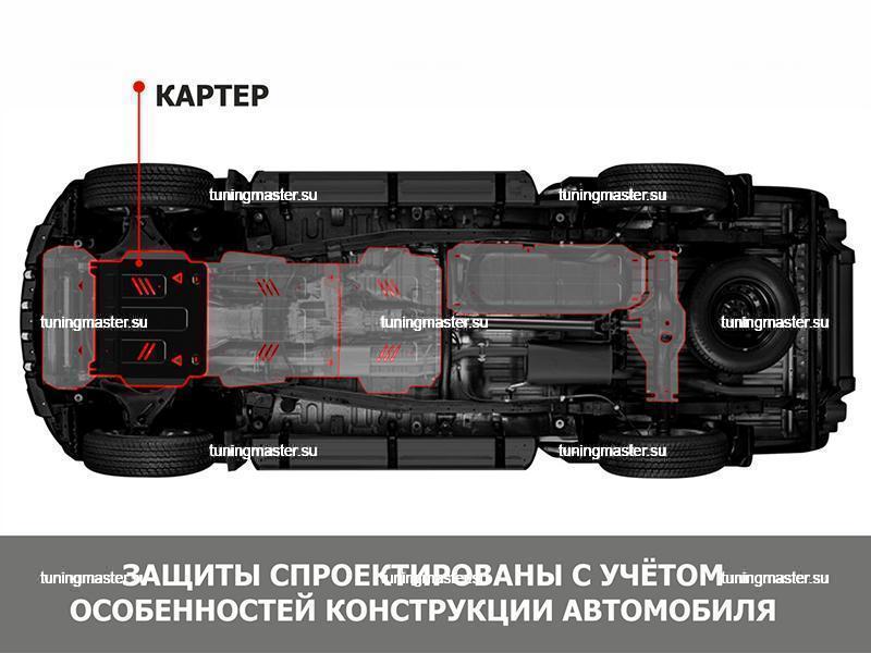 Защита двигателя устанавливается в штатные места без доработки конструкции автомобиля. Крепеж и инструкция по установке в комплекте.