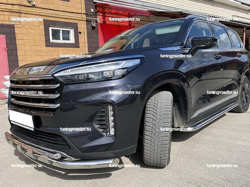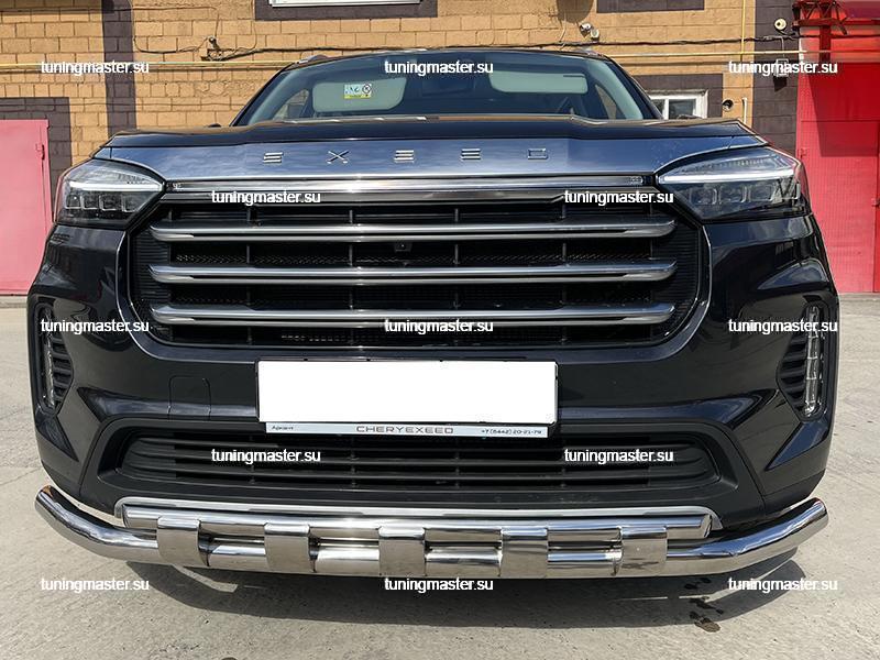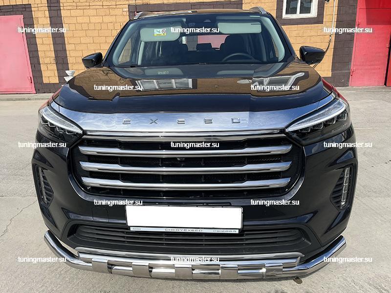 Защита переднего бампера Chery Exeed VX двойная с перемычками Ø60/42. Навесное оборудование для внедорожника Чери Эксид производят из высококачественной нержавеющей стали. Защита переднего бампера устанавливаются на переднюю часть автомобиля. Такая деталь тюнинга способна придать Вашему внедорожнику индивидуальный внешний вид и свести все возможные механические повреждения к минимуму. Защита бампера устанавливается в штатные отверстия, предусмотренные заводом изготовителем. Крепеж и инструкция по установке в комплекте.