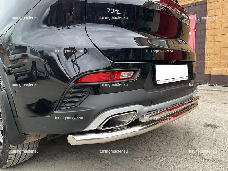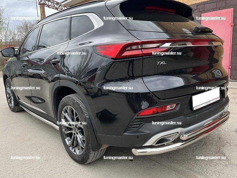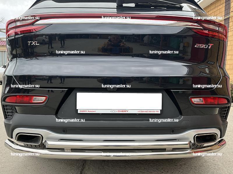Защита заднего бампера Chery Exeed TXL двойная угловая Ø53/42. Для автомобилей с 2020 года выпуска. Навесное оборудование для внедорожника Чери Иксид ТХЛ производится из высококачественной нержавеющей стали. Это обеспечивает исключительную стойкость к коррозии, механическим воздействиям и агрессивным средам. Не ржавеет и не теряет вид долгие годы.
