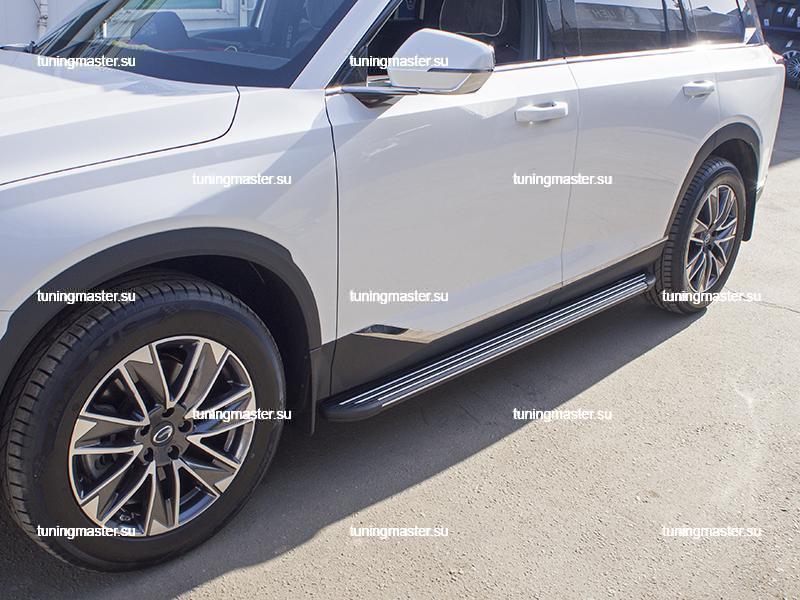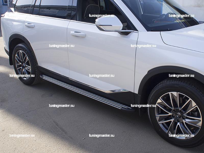 Боковые подножки для GAC GS8 2 (LB007). Пороги боковые для автомобиля ГАК ГС 8 из прочного алюминия. Они упрощают процесс посадки и высадки пассажиров. Обеспечивают защиту кузова от механических повреждений, например, при парковке близко к бордюру или другим препятствиям. Однако установка боковых порогов обычно производится на заводе при сборке автомобиля GAC GS8 NEW. Но по желанию их можно установить отдельно, как дополнительное навесное оборудование. Просто необходимо выбрать подходящие пороги для конкретной модели автомобиля, следуя инструкциям производителя.